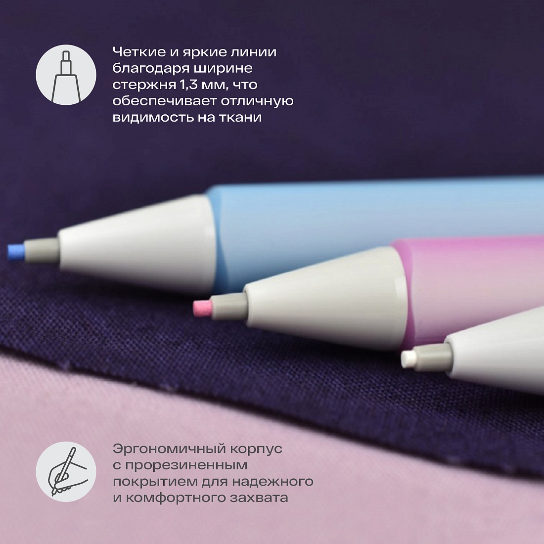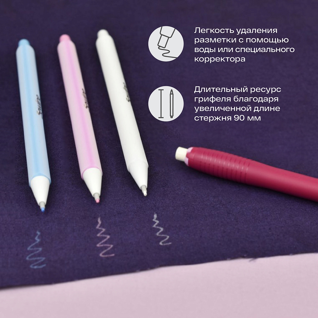 Идеален для работы с плотными и средними тканями (хлопок, лен, деним, шерсть), особенно для темных и цветных материалов. Карандаш незаменим для нанесения точной разметки при раскрое, шитье и вышивке, не повреждая структуру ткани и гарантируя аккуратный результат.
