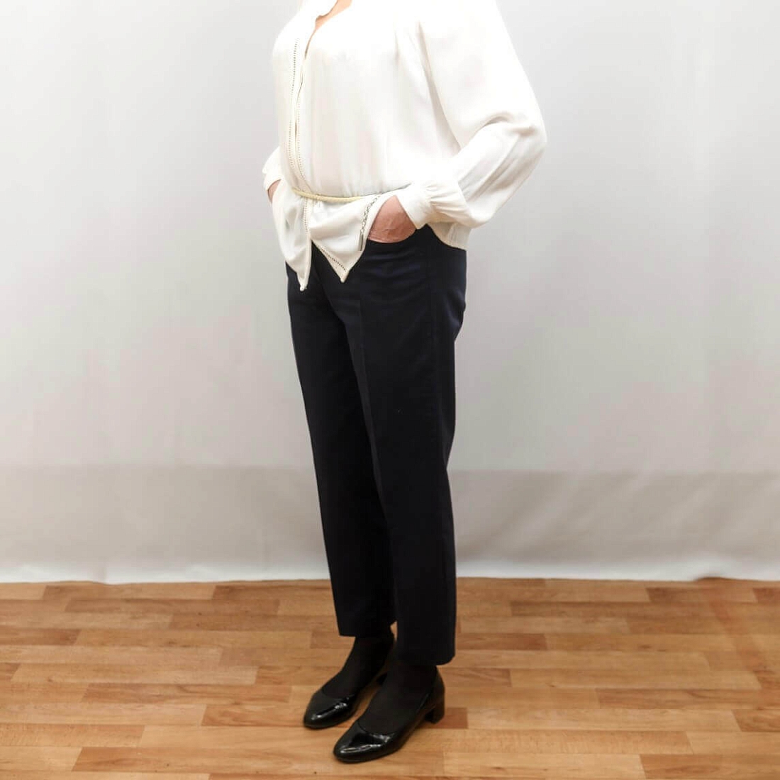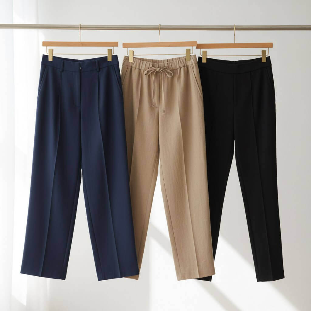 - Пошив и пришивание пояса с корсажной лентой. Финальная влажно-тепловая обработка. Завершение брюк.
